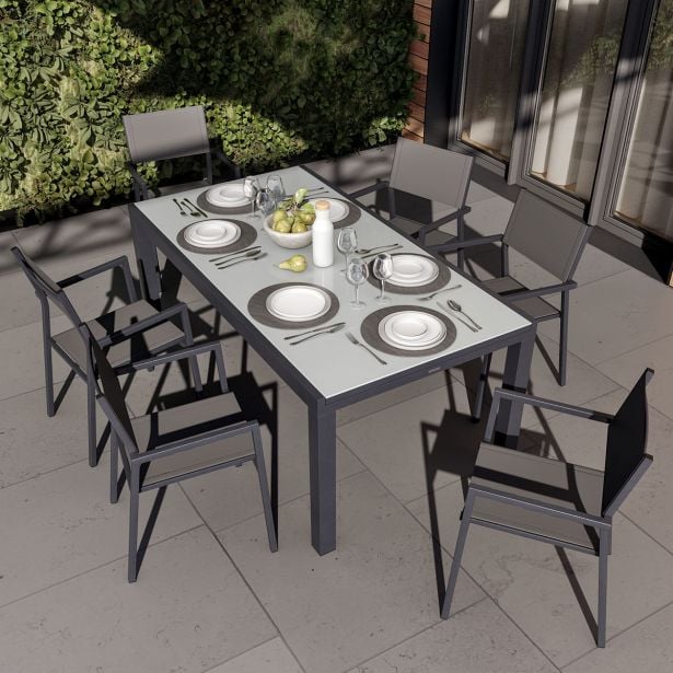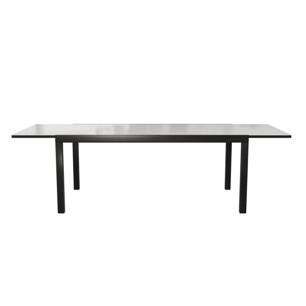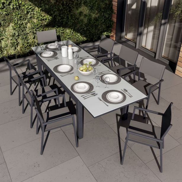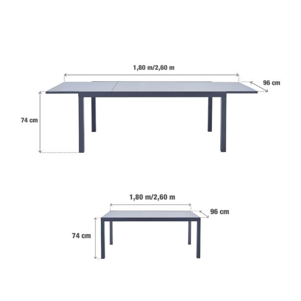 Zahvaljujoč svoji modularni zasnovi vas miza Lyra II vabi, da uživate v obrokih z družino ali prijatelji. Raztegljiva miza Idealna za prijetne trenutke, vrtna miza Lyra II omogoča sprejem do 10 gostov. Modularna zasnova vključuje priročno razširitev, ki vam omogoči hitro povečanje mize iz velikosti za 6 oseb na velikost za 10. Trpežna in vzdržljiva, miza Lyra II je odporna na vremenske vplive. Njena aluminijasta konstrukcija in steklena površina zagotavljata visoko odpornost proti rji in vlagi. Za dodatno stabilnost je miza opremljena s štirimi nastavljivimi nogami, ki omogočajo izravnavo neravnin na terasi ali vrtu. Geometrijske oblike Povabite družino ali prijatelje, da delite prijetne obroke ob mizi Lyra II. Njen pravokotni dizajn in geometrične noge ji dajejo sodoben videz. Ogljeno siva barva prinaša eleganten pridih vašim zunanjim prostorom. Za usklajeno jedilno območje jo kombinirajte s stoli in naslanjači iz serije Orion II. Nasveti za vzdrževanje Miza je praktična za vsakodnevno uporabo, za njeno vzdrževanje pa zadostujeta vlažna krpa in nevtralen čistilni izdelek. Da bi jo ohranili v najboljšem stanju, priporočamo, da jo čez zimo shranite na suhem, zaščitenem mestu, kot je vrtna lopa ali pa jo pokrijete z vodoodpornim pregrinjalom.