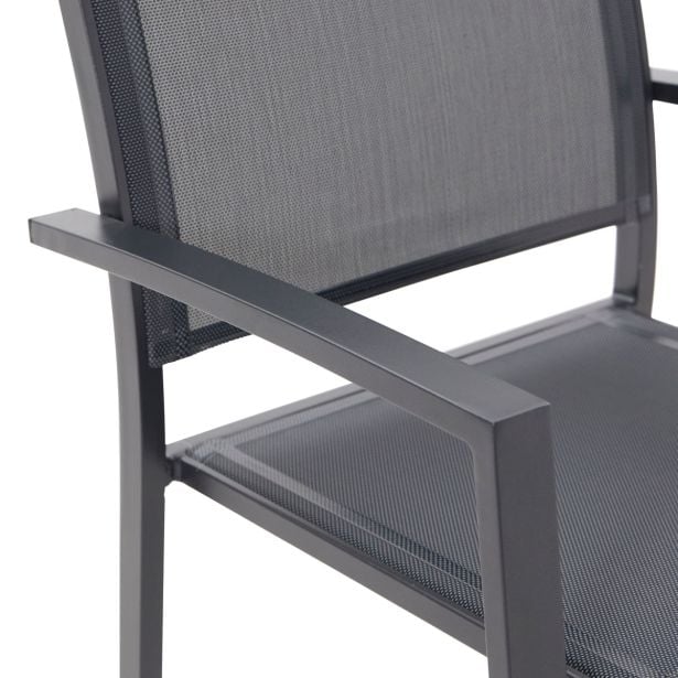 Zložljiv naslonjač – aluminijast okvir, prašno premazan, 2×2 tekstilen, brez blazine, brez okovja. Antracitna barva, z likanim tekstilenom. Ovitek iz kraft papirja.