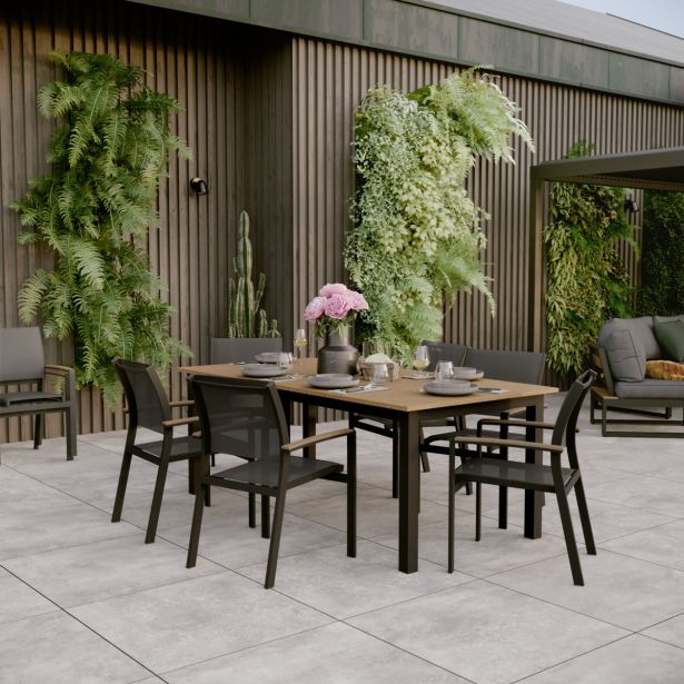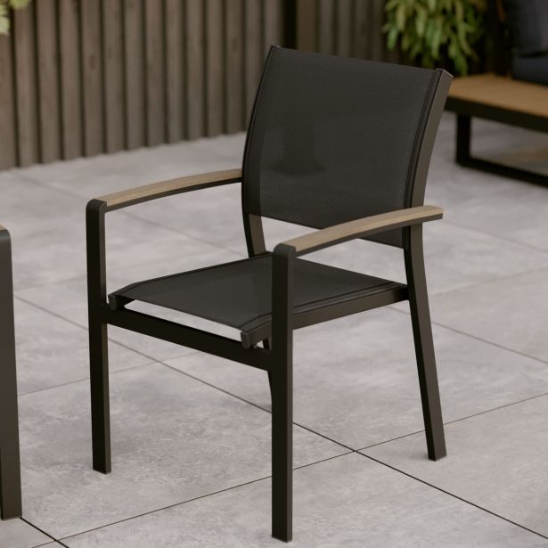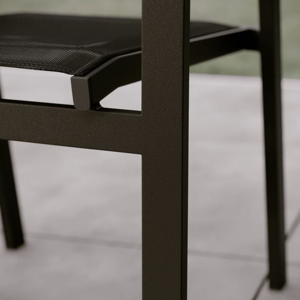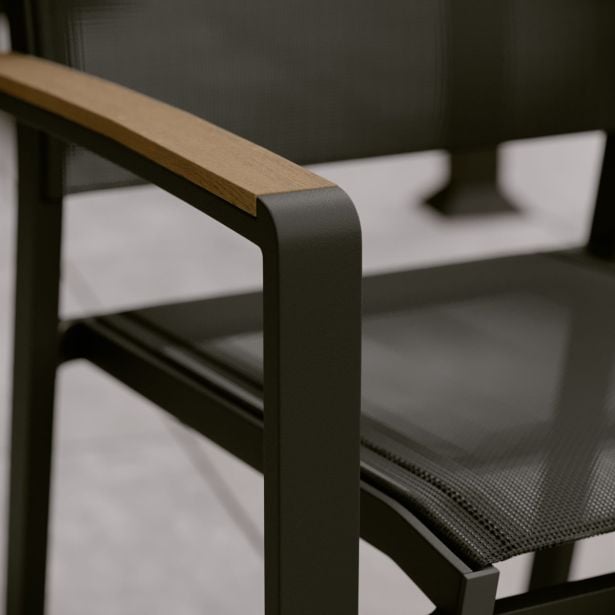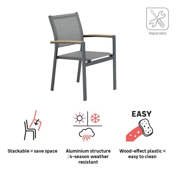 Moderna in udobna jedilna površina za sprejem vaših najdražjih Prijeten večer s prijatelji Vrtni stol Clara ponuja popolno ravnotežje med udobjem in stilom. Sestavljen je iz aluminijastega nosilca in tekstilenske sedežne površine, kar omogoča enostavno premikanje in prilagoditev številu gostov. Naslonjalo in sedež sta narejena iz tekstilena, fleksibilnega materiala, ki zagotavlja udobje in podporo. Aluminijasta struktura stola je odporna na vlago in rjo, kar omogoča dolgotrajno uporabo skozi vse sezone. Poleg tega je stol zložljiv, kar omogoča enostavno shranjevanje, ko ni v uporabi. Mešanica materialov za industrijski videz Serija Clara združuje naravne in moderne elemente, z antracitno aluminijasto strukturo, sintetičnimi lesenimi ročaji in črnim tekstilenom, kar prinaša topel in trendovski industrijski videz vaši terasi. Geometrijske oblike stola povečujejo njegov sodoben karakter. Za harmoničen jedilni prostor kombinirajte ta stol z različnimi mizami Clara in kotno vrtno garnituro Clara, da podaljšate obrok z trenutkom sprostitve. Enostavni materiali za vzdrževanje Stol Clara je zasnovan za enostavno vsakodnevno vzdrževanje. Sintetični leseni ročaji, ki posnemajo videz avtentičnega lesa, zahtevajo minimalno nego. Za obnovo sijaja zadostujeta mokra krpa in Marsejski milo, prav tako tudi aluminijasta struktura. Tekstilenska sedežna površina se enostavno očisti z vodo. Pozimi ne pozabite zaščititi svojih stolov s prepustno prevleko, da jih zaščitite pred slabim vremenom. Popravljiv, rezervni deli so na voljo za podaljšanje življenjske dobe vašega pohištva.