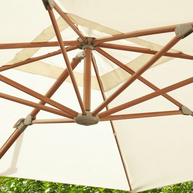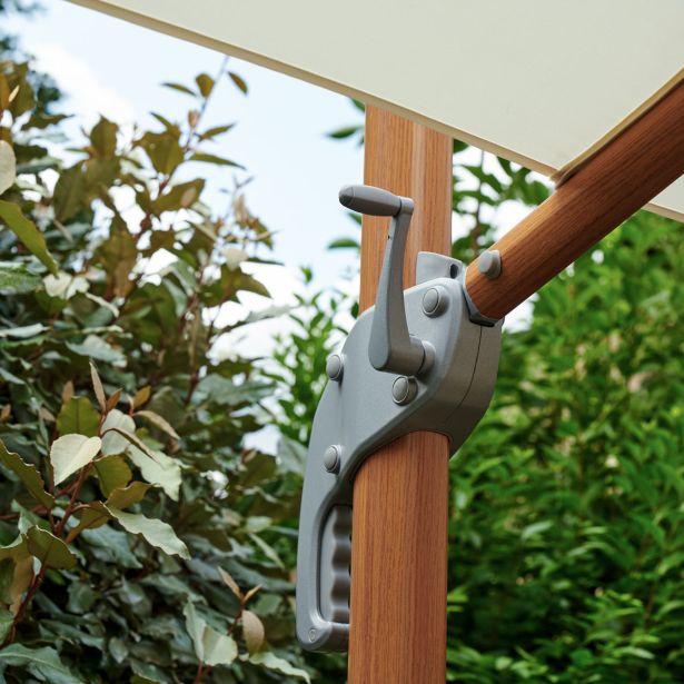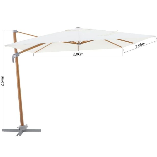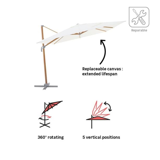 Moderen in enostaven dežnik za sveže popoldneve, leto za letom Optimalna zaščita ob katerem koli času dneva Eleganten in funkcionalen, dežnik Agora je bil zasnovan za zaščito pred soncem v vseh njegovih različicah. Njegova kvadratna in zelo debela tkanina blokira 98 % UV žarkov ter zagotavlja širše zaščitno območje, pod katerim lahko postavite mizo in stole za do 6 gostov. Dežnik Agora ima premaknjen podstavek, rahlo ekscentričen, kar omogoča lažjo namestitev okoli vašega pohištva. S 360° pivotnim steblom in nagnjeno tkanino, ki se bočno premika, boste vedno zagotovili zaščito pred soncem, ne glede na njegov položaj. Enostaven za uporabo Dežnik se enostavno zapre s stransko ročico in vratom. Njegova aluminijasta struktura in jekleni križni podstavek sta odporna proti vlagi in koroziji. Moderen slog Dežnik Agora ne le ščiti pred soncem, ampak tudi prinaša naravni videz vaši terasi ali vrtu. Aluminijast steber z lesnim učinkom in bela tkanina ustvarita topel duh, ki se popolnoma ujema z naravnimi lesnimi serijami, kot sta seriji Oasis in Aurora. Nasveti za uporabo in vzdrževanje Tkanina dežnika je iz poliestra, ki je posebej odporen na UV žarke, zato se verjetno ne bo obarvala. Dežnik je zelo odporen na veter, vendar ga je priporočljivo obtežiti s težo 120 kg (prodaja se ločeno). Pozimi ga zaščitite s primerno prevleko. Enostaven je za vzdrževanje, saj aluminijasto steblo in jekleni žarki ter križni podstavek zahtevajo le čiščenje z vlažno krpo in nevtralnim sredstvom. Tkanino je mogoče zamenjati in prilagoditi vašim željam, da podaljšate življenjsko dobo dežnika.