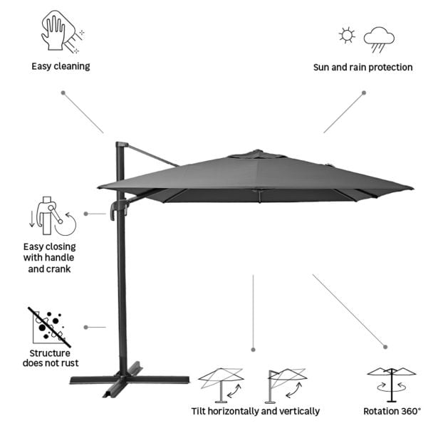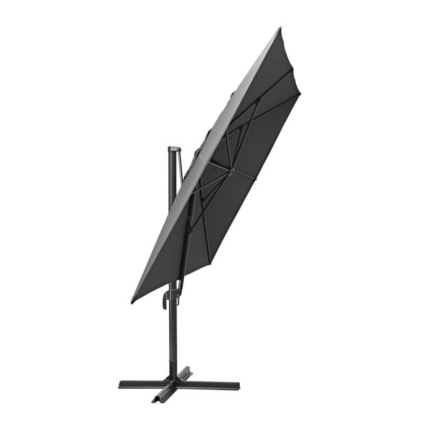 S senčnikom Aura se zasčitite pred soncem v elegantni temno sivi barvi. Na voljo v več odtenkih, zagotavlja vrhunsko zaščito, obenem pa omogoča neovirano gibanje zaradi svojega odmaknjenega podnožja. Optimalna zaščita Uživajte v sončnih dneh brez bleščanja in neudobja! Senčnik Aura učinkovito ščiti vas in vaše goste, ne glede na to, ali uživate v družbi ali samostojno. Njegovo pravokotno platno je izjemno debelo, vodoodbojno in blokira 100 % UV žarkov, kar zagotavlja popolno zaščito pred soncem. S široko površino ponuja dovolj prostora za postavitev mize in stolov za osem oseb. Osrednje podnožje senčnika je rahlo izven sredine, kar omogoča enostavno postavitev brez oviranja prehoda. Praktičnost za vsakodnevno uporabo Senčnik Aura je zasnovan za enostavno upravljanje in prilagodljivost vašim potrebam. Ko se sonce premika, ga lahko enostavno zasukate za 360° ali nagnete, da zagotovite optimalno zaščito skozi ves dan. Po uporabi ga hitro zaprete s pomočjo bočnega ročaja in mehanizma za preprosto krmiljenje. Njegova aluminijasta struktura je odporna na vlago in korozijo, kar zagotavlja dolgo življenjsko dobo. Sodoben videz Senčnik Aura ne le ščiti pred soncem, ampak tudi popestri vaš zunanji prostor. S svojo kvadratno obliko in elegantno temno sivo barvo bo dodal sodoben pridih vaši terasi ali vrtu. Za popoln in usklajen videz ga enostavno kombinirajte z drugimi izdelki iz iste serije. Nasveti za uporabo in vzdrževanje Ker senčnik Aura lahko prenese veter, ga je priporočljivo pritrdite z utežmi (na voljo ločeno), da zagotovite stabilnost. Za optimalno zaščito pozimi senčnik pokrijte z ustreznim prekrivalom. Enostavno ga očistite z vlažno krpo in nevtralnim čistilom. Platno je zamenljivo, kar omogoča prilagoditev vašim željam in podaljša življenjsko dobo senčnika.