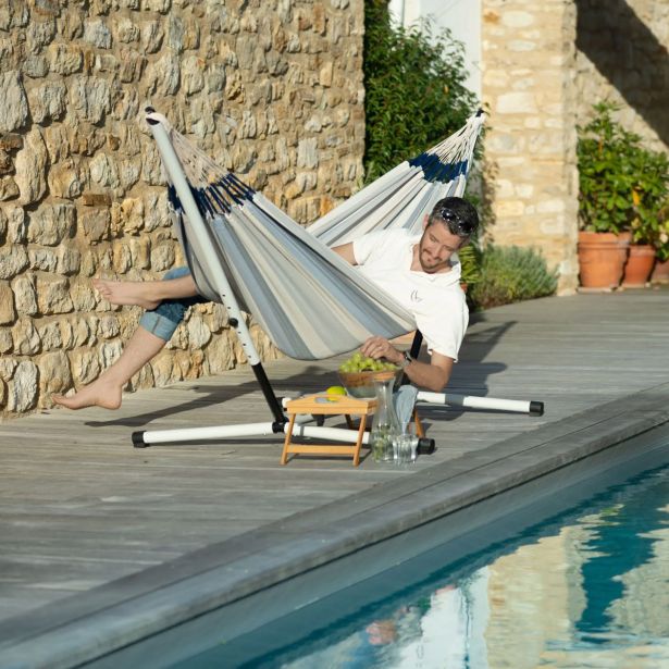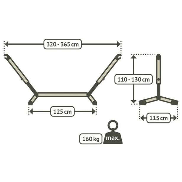 Zelo močno jekleno stojalo za visečo mrežo. Stojalo sestavite ali razstavite v dveh minutah in ga zato lahko peljete s seboj kamorkoli in si ustvarite svojo oazo miru. Odporno proti vremenskim vplivom. Nastavljivo po višini.