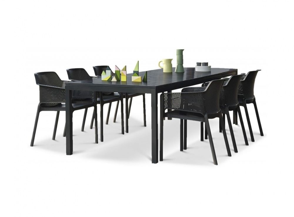 Moderna raztegljiva vrtna garnitura proizvajalca NARDI. Garnituro sestavlja raztegljiva miza RIO 210 v antracit barvi, dimenzije 210 ter 8 stolov NET prav tako antracit. Miza je kvalitetne izdelave z vrhnjo ploščo DurelTOP iz polipropilena z anti-UV obdelavo. Miza je odlično zasnovana in omogoča neovirano sedenje pri mizi, tudi ko je le ta raztegnjena. Miza se raztegne s pomočjo drsnega mehanizma, kateri omogoča, da so noge mize vedno na koncu mize. Dobra zasnova mize, mizi zagotavlja izredno stabilnost tudi ko je le ta raztegnjena. Miza se raztegne na dimenzijo 280cm. Okvir mize je iz prevlečenega aluminija. Kvaliteten vrtni stol NET iz steklenih vlaken, okrašen z radialnim vzorcem kvadratnih perforacij po celotni površini sedeža. Net stol ima mat površino in je prijeten na otip. Materiali iz katerega je vrtno pohištvo NARDI so primerni za recikliranje in so izredno UV odporni.