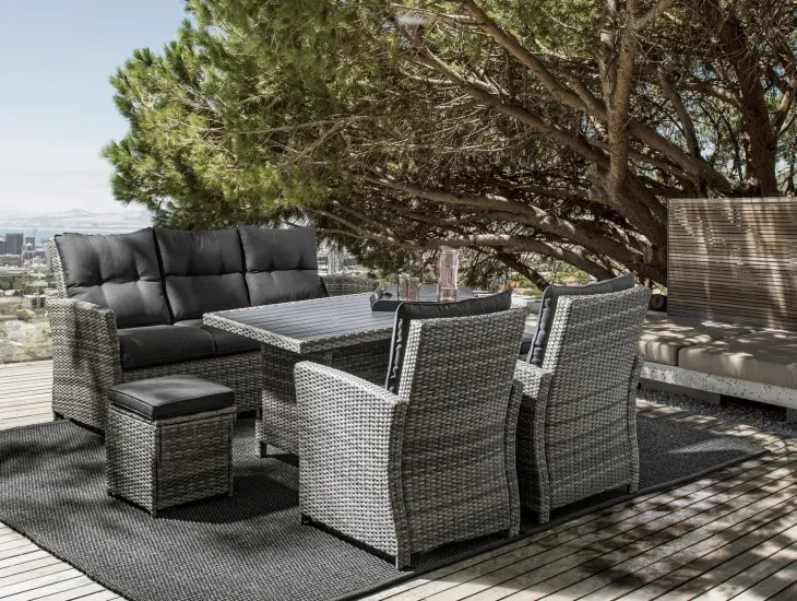 Sedežna garnitura ARIEL je narejena iz aluminijastega okvirja, prepletena je s sintetičnimi polkrožnimi vlakni. Blazine na sediščih in naslonjalih so snemljive (100% polipropilen) in tako enostavne za vzdrževanje. Okvir mize je iz aluminija.